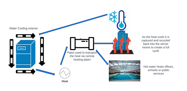 HydroHeat solves problem by distributing small data centres around the country with each one being powered by sustainable sources (solar panels). All of the heat generated can then be repurposed to benefit social enterprises such as community swimming pools, who could then generate revenue by renting premises to data hosting companies as well as saving on their own heating bills.